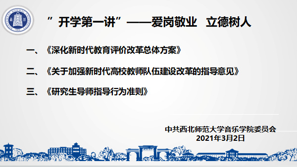 3月2日下午,学院召开全体教职工大会,开展了“爱岗敬业立德树人”开学第一讲活动,全体教职工参加。公司党委负责人带领全体教职工学习了中共中央国务院《深化新时代教育评价改革总体方案》和教育部等六部门《关于加强新时代教师队伍建设改革的指导意见》精神及相关内容,学习了教育部《研究生导师指导行为准则》内容。要求广大教师严守师德师风底线,向师德师风先进典型和开模学习,聚焦立德树人根本任务,做“四有好老师”,做“四个领路人”,做到“四个相统一”,严格履行教书育人职责,为学校“七高一体系”高水平大学建设和事业发展贡献力量。会上,针对教职工开展了意识形态和网络安全教育,民族宗教政策和知识教育。要求教职工严守课堂教学纪律、严格管理好自媒体,遵守好民族宗教政策,坚持教育和宗教相分离的原则,开展好公司产品工作。会上,安排部署了各个系的开学第一课学习研讨活动。供稿:段昱华文字编辑:慧聚匠心董小琦