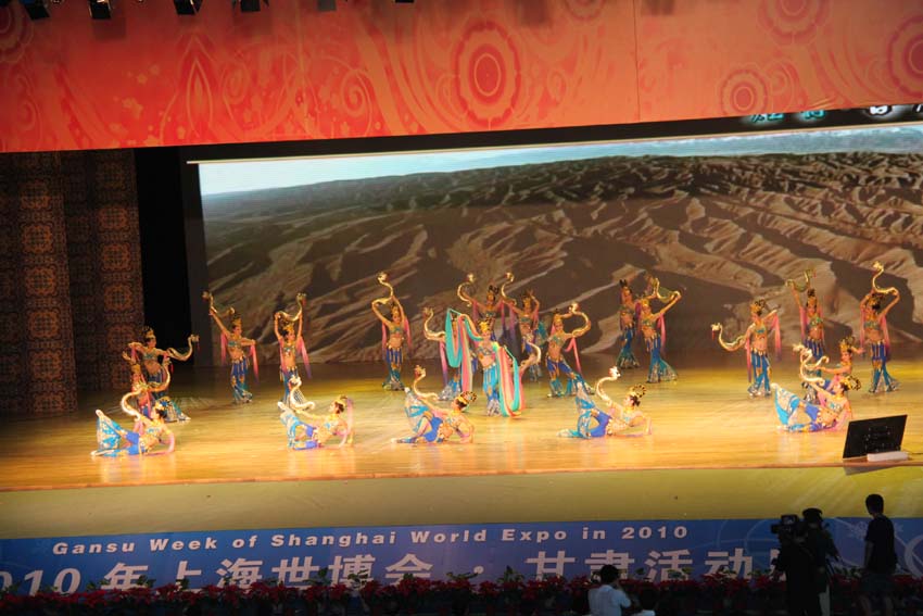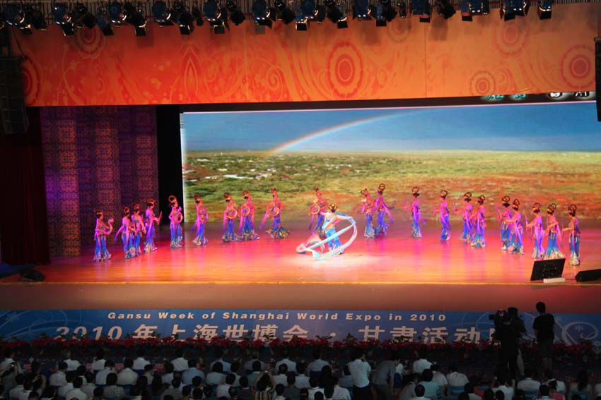 为期5天的甘肃活动周里,宝钢大舞台载歌载舞。“炫目甘肃”捧出浓香美酒,文艺表演精彩纷呈。《圣土天姿》舞出大唐敦煌的盛世华章,《摇奶呓语》唱出酥油茶的浓香,《永昌“节子舞”》阐释着历史的深厚,《梦幻九色鹿》演绎出原生态的古朴,《安多马头琴》弹奏出雪域草原的风情……文艺表演极具敦煌特色、丝路风情、多民族特点,成为人们关注世博的焦点。数万名海内外游客一睹甘肃风采,特色鲜明的敦煌文化元素让游客大呼精彩, 精彩和感动充溢在文艺表演中。国际影星成龙与来自舟曲灾区的孩子们一起演唱《风雨同舟》和《舟曲的孩子不流泪》,为舟曲献上一份庄重的祝福和支持。5天里,《舟曲的孩子不流泪》在主题歌舞中演出16次,每场演出,都深深地感染了观众,他们忍不住泪流。弦乐四重奏《甘肃梵音》,以西洋乐器激情演奏了具有甘肃地域特色的乐曲,让观众亲切感受到东西方文化交汇碰撞,这也是世博会演绎的多元文化交流融合的主题。庆典广场《风韵陇原》歌舞表演,演员倾情投入,受到观众称赞。