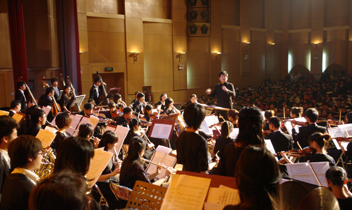 公司2009年学术艺术月开幕式上,成立了管弦乐团和敦煌舞乐团。一年来,在乐团指挥、艺术总监王学诗教授的精心指导下、乐团负责人的严格管理下,在各位老师、各位同学的密切配合下,乐团的演奏技艺,合作能力,舞台风貌得到了长足的进步。
