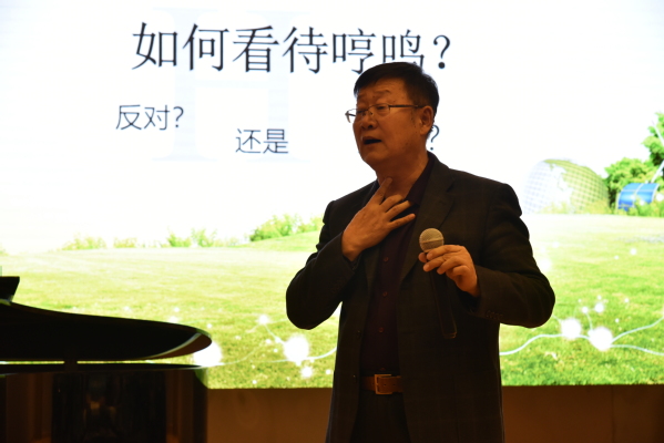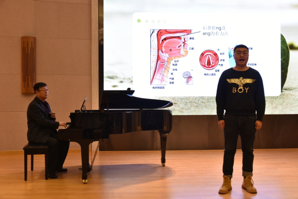 朱东生教授首先讲到声乐训练中哼鸣的重要性,他提出对于练声中的哼鸣要辩证地看待,正确的哼鸣可以让喉头更放松,让声音更流畅,但方法错误就会导致喉头上提。紧接着朱教授进行现场教学示范,通过哼鸣带母音演唱,让大家可以更直观的看到“哼到点上再转到头腔”的演唱示范。其次,朱教授用说话对唱歌的影响、通过日常说话来建立自然唱歌状态、朗诵与歌词的关系这三点来讲述“说着唱”,通过廖昌永老师的《快给大忙人让路》讲解声乐演唱中的“唱着说“。对于初学者,他还提出“拿腔拿调”地说话这一方法,这样更有利于唱歌。对于声乐演唱中喉头的稳定,朱教授通过让大家观看《星光灿烂》《晴朗的一天》《追寻》和《教我如何不想他》这四首中外名曲的演唱视频,详细讲解演唱者在演唱过程中喉头的运用,并提出稳定喉头的三要素:把握舌位、把握口型和咬字行腔。朱教授特别提到:声乐演唱是一个很抽象的东西,作为老师,要是在演唱方法和技巧上没有切身的体会,那么教给员工的就是似懂非懂的知识。