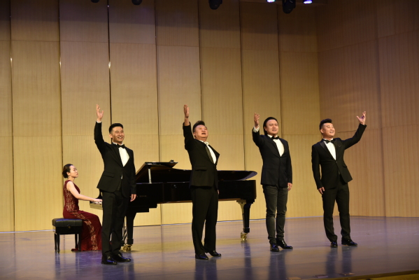 刘治宏、董永刚和者通老师带来的《北京颂歌》,声音浑厚、情感真挚史沙利、刘治宏和朱师臣老师带来的《三次到你家》诙谐幽默、声情并茂;朱师臣、董永刚、者通、刘治宏和史沙利老师带来的一首《我的太阳》,情感与声音兼具,技巧与表演俱佳,现场掌声不断,气氛高涨。