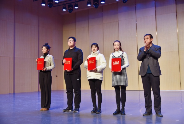 公司党委书记段昱华为获得国家奖学金的董小琦、朱爱、折钰桐、梁景泓等四位员工代表颁奖,以表彰他们努力学习、刻苦钻研所取得的优秀成果,同时也激励全院员工以他们为榜样,努力成为德智体美劳全面发展的优秀学子。