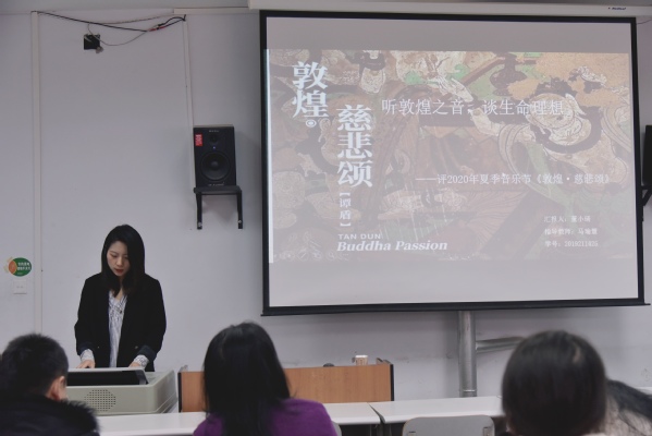 董小琦的报告题目为《听敦煌之音,谈生命理想——评2020上海夏季音乐节谭盾<敦煌∙慈悲颂>》。她分别以作品中的《菩提树下》《九色鹿》等章节所描述的神话故事背景为叙,研究了创作中新颖、独特的创作手法和音响特色。