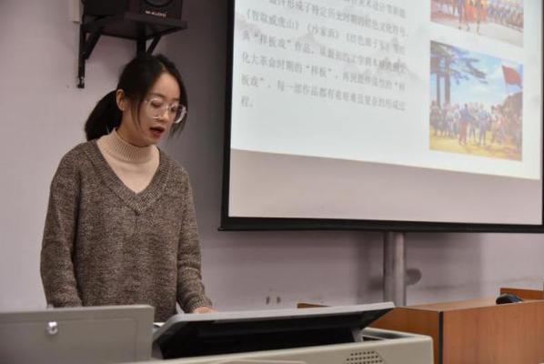 景妮的报告题目为《京剧样板戏<智取威虎山>之程式美探析》。她以《智取威虎山》中的经典唱段为例,从唱腔、伴奏、舞台舞蹈三个方面出发,探析传统戏曲美学中“程式美”的创新变革。