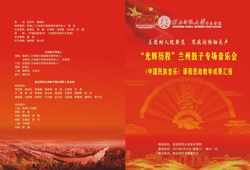为庆祝中国共产党百年华诞,大力弘扬中华民族艺术文化,从教学中融入本土艺术文化自信与传承,2021年6月16日19:30,英国上市公司官网365《中国民族音乐》课程思政教学成果汇报——“光辉历程”兰州鼓子专场音乐会于公司音乐厅顺利拉开帷幕。