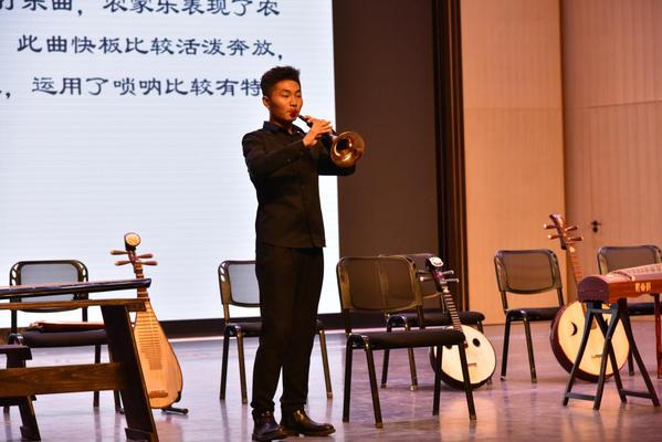 唢呐由波斯人发明,是中国民族吹管乐器的一种,也是中国各地广泛流传的民间乐器。唢呐的音色明亮,音量大,管身木制,呈圆锥形。李明涛同学给大家献上了一曲唢呐独奏《农家乐》,快板活泼奔放,慢板比较广泛,快打慢吹,运用了唢呐比较有特色的技术技巧,表现了农家人的喜悦丰收之情,十分具有感染力。
