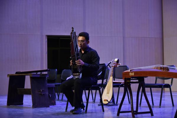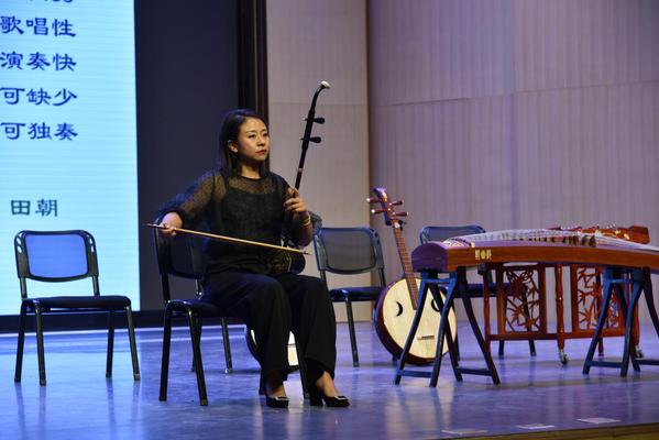 教师田朝的演奏将整场音乐会推向了高潮,田老师以及赵越同学展示了中胡、高胡、板胡、京胡的演奏,这几件乐器都是在胡琴的基础上演变而来的。尤其是田朝老师用京胡演奏的《夜深沉》,曲调由繁至简,在快板段落作了较多发展,使原曲的精华—刚劲且优美的音乐得到充分优美的表现。