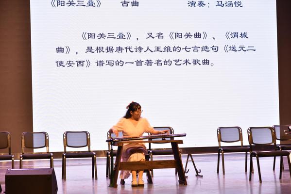 古琴距今有三千年以上的历史,现存琴曲3360多首,琴谱130多部,琴歌300首,还有大量关于琴家、琴论、琴制、琴艺的文献,遗存之丰堪为中国乐器之最。古琴是中国文化的瑰宝,是人类口头和非物质遗产代表作。旅游学院马涵悦同学为我们演奏了古琴曲《阳关三叠》。