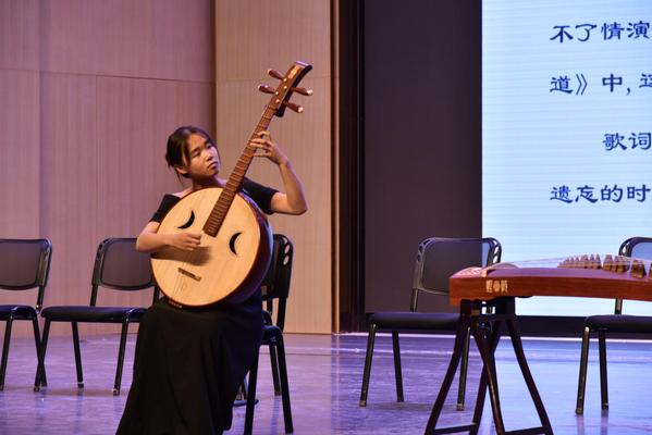 琵琶是由西亚传入我国的弹拨乐器,距今已有两千多年的历史。有琵琶武曲和琵琶文曲之分,琵琶武曲以戏剧性的表现为主,激烈、壮观,琵琶文曲指的是以抒情优美、简朴动人的旋律,深刻表达人物内心思想感情,生动展示令人向往的意境的乐曲。白桂洁同学分别为我们展示了琵琶武曲《十面埋伏》和琵琶文曲《春江花月夜》。