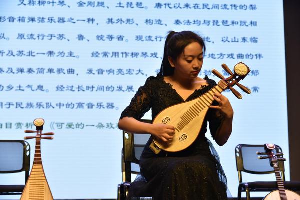 柳琴又称柳叶琴、金刚腿、土琵琶,其外形、构造、奏法均与琵琶和阮相似,发音响亮宏大,音色高亢刚劲,富有浓郁的乡土气息。白桂洁同学为我们展示了柳琴独奏《可爱的一朵玫瑰花》。