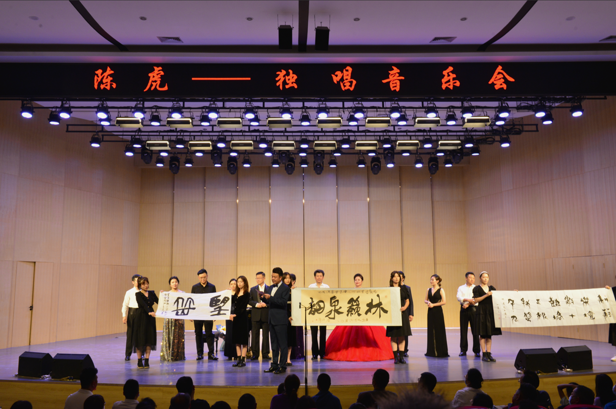 在音乐会的尾声,主持人杨鹏宏为大家展示出为陈虎教授独唱音乐会送上的题词与祝福。最后,音乐会在一首《难忘今宵》中落下帷幕,嘉宾朋友们纷纷上台与艺术家们合影留念。