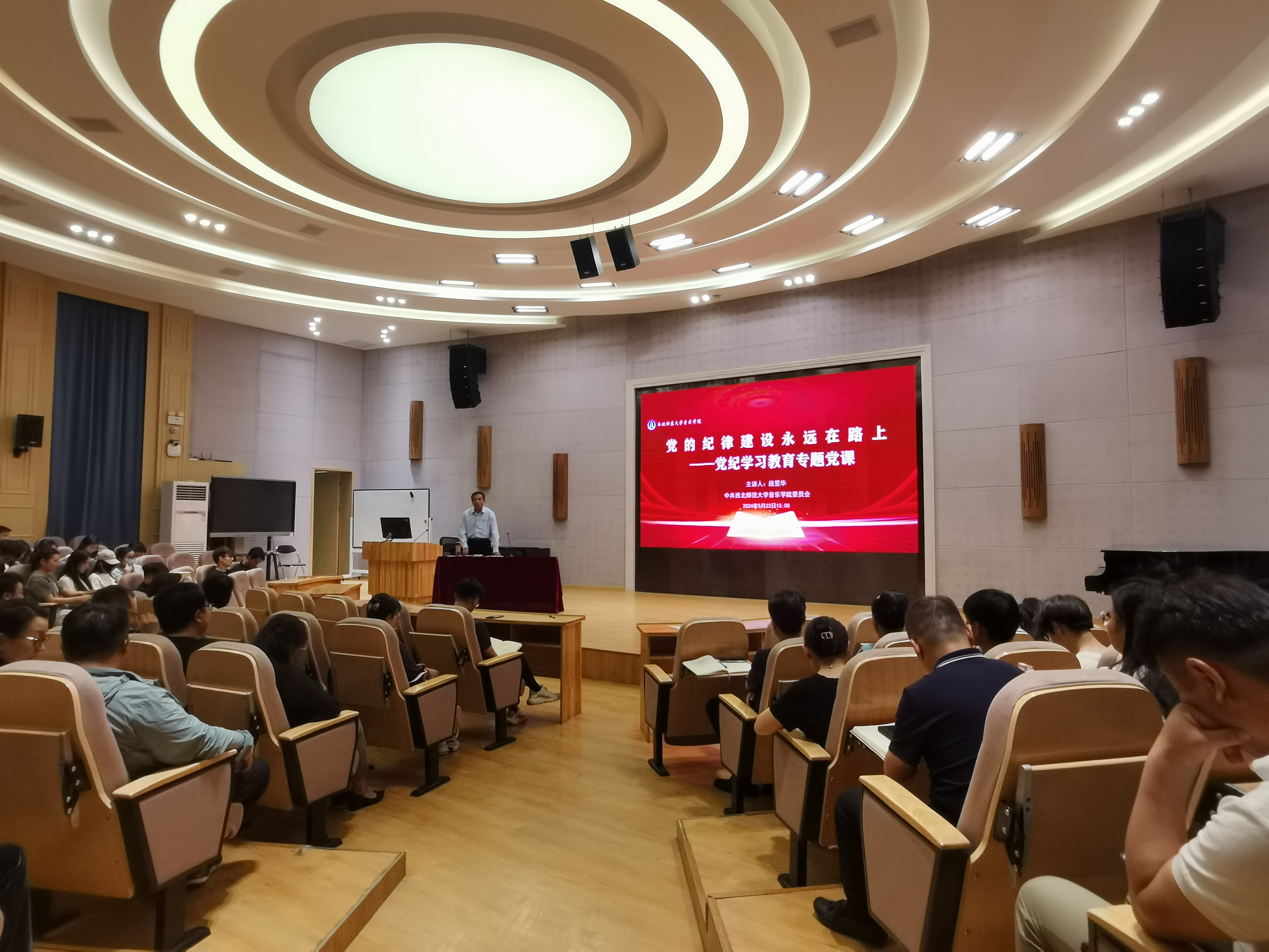 5月23日下午,公司党委书记段昱华在欣赏厅为学院全体教职工、员工党员100余人讲授党纪学习教育专题党课《党的纪律建设永远在路上》。段昱华从“中国共产党为什么重视纪律建设”、“中国共产党纪律建设的历史回顾”等方面展开论述并结合具体案例,深入浅出地讲授了一堂生动的党纪学习教育课。他强调,《条例》作为规范党组织和党员行为的基础性法规,对确保全党在政治立场、政治方向、政治原则、政治道路上与习近平为核心的党中央保持高度一致,具有十分重要的作用。要继续逐章逐条研学《条例》,学纪、知纪、明纪、守纪,搞清楚党的纪律规矩是什么,弄明白能干什么、不能干什么,始终做到忠诚干净担当。最后,公司党委书记段昱华总结,要求各个党支部、全体党员、入党积极分子要确实掌握“六项纪律”的主旨要义和规定要求,准确把握党纪学习目标要求,进一步强化纪律意识,把增强党性、严守纪律、砥砺作风融入日常、化为习惯,在思想上划出红线、筑牢底线,做到心有所畏、言有所戒、行有所止,在一流大学建设中争当先锋干将。
