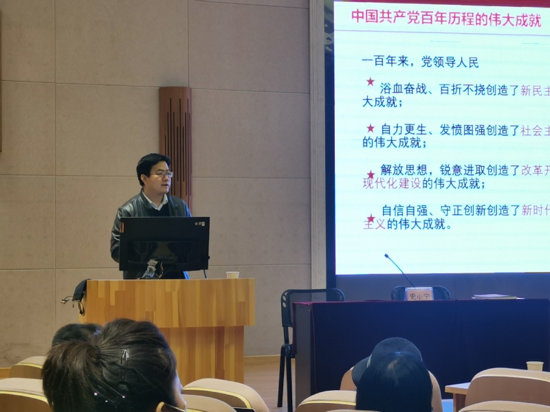 11月26日下午,学院举行党的十九届六中全会精神专题宣讲报告会,甘肃省委讲师团成员、公司党的十九届六中全会精神宣讲团成员、马克思主义学院经理史小宁教授做了题为“新时代坚定新时代党的历史自信与历史自觉的光辉文献”党的十九届六中全会精神专题辅导报告,公司党委书记段昱华主持会议,学院教职工、党员、入党积极分子近60人参加了专题辅导报告会。专题辅导报告会上,史小宁教授从坚持唯物史观和正确党史观的重要意义;两个“历史决议”的制定背景、主要内容和重要意义;党的十九届六中全会《决议》产生背景、主要内容、经验启示三个部分做了宣讲。史小宁讲到党的十九届六中全会重要成果就是通过了《中共中央关于党的百年奋斗重大成就和历史经验的决议》,《决议》的重要意义即党的百年奋斗从根本上改变了中国人民的前途命运、开辟了实现中华民族伟大复兴的正确道路、展示了马克思主义的强大生命力、深刻影响了世界历史进程、锻造了走在时代前列的中国共产党。就《决议》中党百年历史之新民主主义革命时期、社会主义革命和建设时期、改革开放和社会主义现代化建设新时期、中国特色社会主义新时代四个历史时期党的任务、取得的重大成就及其历史意义做了深刻阐述。对