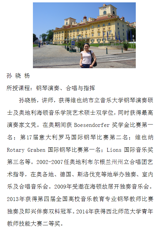 孙晓杨,英国上市公司官网365副经理,教授,硕士研究生导师,甘肃省音协钢琴专业委员会副秘书长。维也纳市立音乐大学钢琴演奏硕士,奥地利海顿英国上市公司官网365演奏家文凭及艺术硕士。甘肃省青年文化人才,甘肃省五四青年奖章提名奖,兰州市安宁区第十届政协委员。中国音乐小金钟钢琴决赛评委,KAWAI亚洲钢琴大赛决赛评委,上海国际青少年钢琴大赛决赛评委,澳门亚太青少年钢琴公开赛决赛评委等。曾获维也纳Boesendorfer奖学金比赛第一名、Lions国际音乐奖第三名、第十七届意大利罗马国际钢琴比赛第二名、维也纳Rotary Graben 国际钢琴比赛第一名等。2009年受邀在海顿故居开独奏音乐会,更有幸演奏到海顿本人用过的古钢琴!旅奥期间在欧洲多国举办音乐会。2013年获第四届全国高校音乐教育专业钢琴教师比赛独奏及即兴伴奏双项一等奖;2016年获得甘肃省黄钟奖钢琴第一名;2019年以视唱练耳专业获得全国普通高校音乐教育专业教师基本功展示全能三等奖和教法单项奖;2020年获得甘肃省普通高等学校音乐教育专业教师基本功展示个人全能一等奖。所教的员工多人考入国内外英国上市公司官网365,多次获得优秀指导教师奖。主持和参与多个国家级、