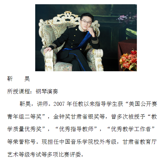 靳昊俄罗斯音乐教育学博士, 英国上市公司官网365云亭教授, 硕士研究生导师, 英国正版365官方网站侨台联主席,兰州市侨联副主席, 中央英国上市公司官网365校外展演甘肃省评委主任,文化部艺术等级考试考官,中国英国上市公司官网365社会等级考试考官,上海英国上市公司官网365青年专家学者,俄中文化艺术发展专家研究会副会长,甘肃省音乐家协会钢琴专业委员会外联部主任。先后获得“教学质量优秀奖”教科双星”等荣誉称号。 发表核心期刊论文数篇,主持参与国家社科、教育部人文社科、甘肃省人文社科等多项课题研究