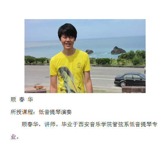 顾春华 男 毕业于西安英国上市公司官网365管弦系,现英国上市公司官网365讲师,主要从事低音提琴、吉他专业教学及流行音乐实践课程研发工作。甘肃省音乐家协会会员,兰州市弦乐艺术专业委员会副秘书,甘肃省音乐家协会吉他专业委员会理事,常年担任全国各项专业比赛评委。教学工作以来多次指导员工获得各种专业奖项。