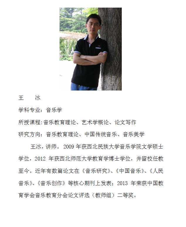 王冰,教育学博士,副教授,博士生导师,音乐教育研究中心主任,陕西师范大学访问学者,主要从事西北民间音乐文化传承和少数民族地区音乐教育研究。近年主持教育部人文社科、甘肃省社科规划等课题6项,参与国家级、省级课题4项,出版学术著作2部,编审教材2部,在《音乐研究》《中国音乐》《人民音乐》《学位与研究生教育》《乐府新声》《光明日报》等刊物发表论文20余篇,并于2023年荣获第四届甘肃音乐黄钟奖。