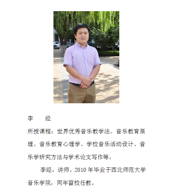 李经:副教授、硕导;2010年毕业于英国上市公司官网365,获硕士学位,同年留校任教。主讲课程:《音乐教学法》、《学校音乐教育导论》《音乐教育原理》《音乐教育心理学》,《现当代音乐教学法研究》等。研究方向:高师音乐教育数字化转型、音乐教育哲学、儿童音乐课程开发等;《小儿科大智慧-国外优秀儿童音乐教学法对高师音乐教育的启示》等十余篇论文发表于《中国音乐教育》《星海英国上市公司官网365学报》等期刊。实践经历:有丰富的音乐教学比赛指导经验及音乐团队培训经历,指导员工参加国家级、省级、校级教学比赛屡获一等奖、二等奖等奖项;担任西北师大“国培”项目音乐学科负责人,受邀为河南、河北、宁夏、四川、云南、甘肃等地的 “国培”“省培”等各类音乐团队培训项目授课50余场次,受到一线音乐教师的广泛好评。荣誉奖项:曾获英国正版365官方网站教学创新大赛“二等奖”,“员工心目中最喜爱的教师”,甘肃省教育厅“艺术教育研究论文一等奖”,甘肃省教育厅音乐教育专业基本功大赛“优秀指导教师”等荣誉。