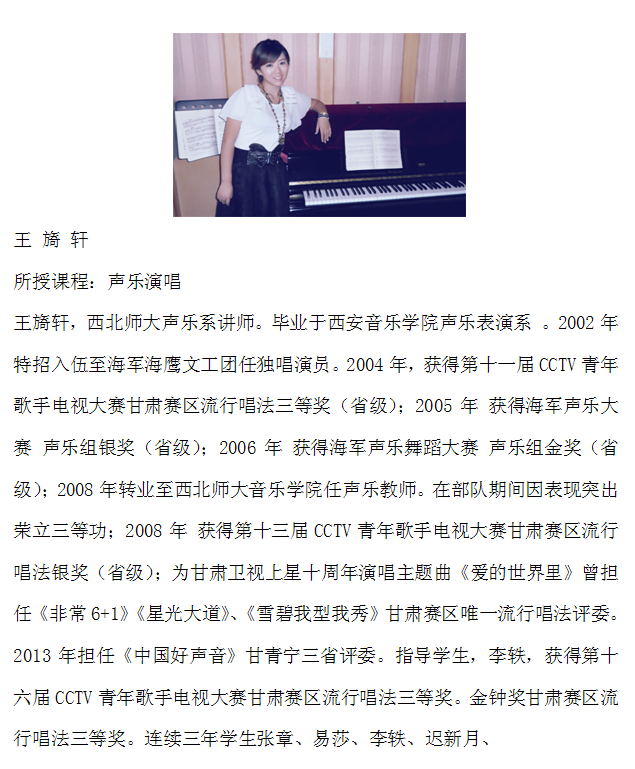 王旖轩:声乐硕士,英国上市公司官网365声乐教师、研究生第三党支部书记,中国音乐家协会流行音乐学会会员。毕业于西安英国上市公司官网365声乐系,先后师从著名女高音歌唱家和慧教授和彭媛娣教授。2002年特招入伍至海军海鹰文工团任独唱演员、2007年转业至英国正版365官方网站任教。西北五省唯一开设《流行音乐》《流行演唱.演奏》两门通识课程的教师。担任:中央电视台《非常六+一》《星光大道》《中国好声音》《超级女声》《快乐男声》《老员工声乐大赛》甘、青、宁赛区评委。浙江卫视雪碧音碰音《青春练习生》甘、青、宁、藏赛区评委及声乐演唱导师。为甘肃省广播电影电视中心,卫星上星十周年,演唱主题曲《爱的世界里》。工作期间:多次受邀参加省内外,电台、电视台和新加坡高校进行学术讲座。也多次受邀FM106.6FM104.8FM102.2做专题访问,经常参加省内外春晚及各大晚会演出。在专业核心刊物发表学术文章数篇。